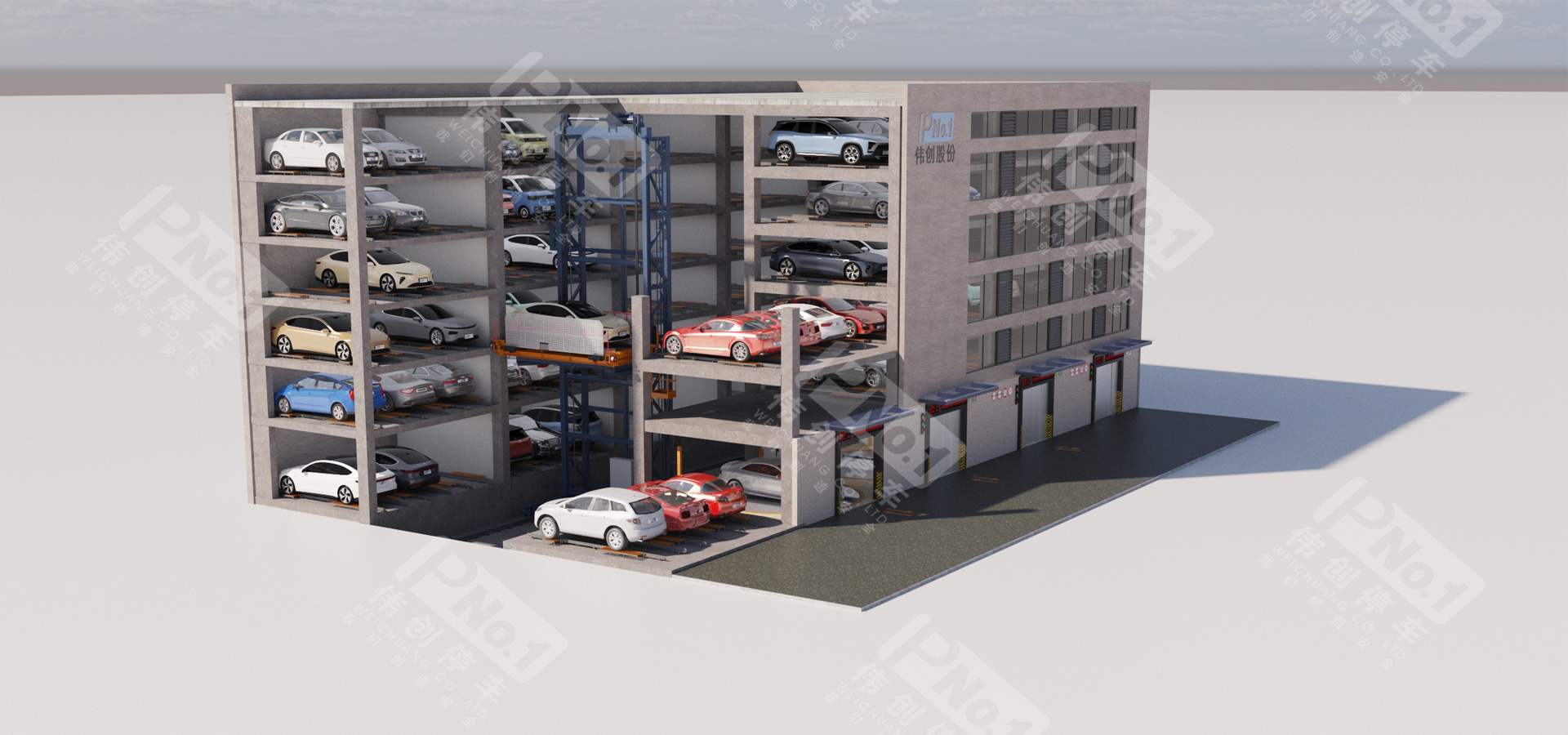偉創(chuàng)巷道堆垛類機械停車設(shè)備采用先進(jìn)的計算機控制,是一種集機、光、電、自動控制為一體的全自動化機械式停車設(shè)備。使用堆垛機將汽車水平且垂直移動到停車位旁,并運用載車板搬運器或堆垛機上的存取機構(gòu)將汽車存入,反之取出。